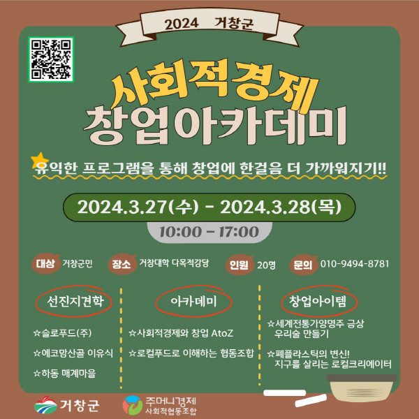 사회적경제를 준비하는 기업가나 창업 희망자, 관심 있는 군민은 누구나 신청 가능하며, 경제기업과 공동체일자리담당(055-940-3352)으로 신청하면 된다.