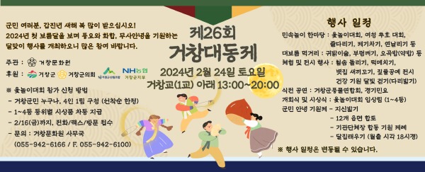 오는 24일 13시 민속놀이 한마당을 시작으로, 다양한 세시풍속 체험 행사와 거창군풍물연합회의 지신밟기, 군민안녕 기원제 순으로 진행된다.