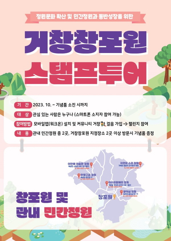 스탬프 존이 있는 민간정원 중 2개소 이상과 거창창포원 내 2개소 이상의 장소에서 스탬프를 획득하면 거창창포원 행정실에서 선착순으로 △토피어리 키트 △창포꽃 씨앗과 그립톡 세트 중 하나를 받을 수 있다.