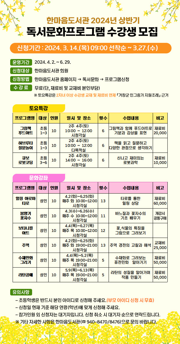 초등학생들을 대상으로는 △그림책푸드아트 △큐보로봇코딩 △하부르타질문놀이 3개 강좌가 준비되어있고, 성인 대상으로는 △힐링아로마타로 △봄향기 꽃자수 △보타니컬아트 △주역 △수채민화그리기 △라탄공예 6개 강좌로 마련했다.