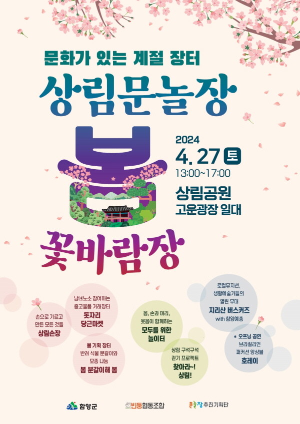 누구나 참여 가능한 상림 문화놀이장날은 상림 손장(손으로 기르고 만든 모든 것), 기획장터(봄 분갈이 해 봄), 돗자리 당근마켓(중고물품 거래장터)&팝업 놀이터, 환경장터(장농을 열장!), 상림걷기 프로젝트(찾아라~ 상림), 지리산 버스커즈(함양예총), 오프닝 공연 등으로 열린무대가 펼쳐질 예정이다.