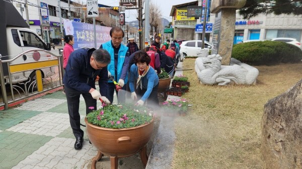 지역주민, 산불감시원, 면 직원 등 30여 명이 참여해 면소재지 거리를 아름다운 봄꽃으로 단장했다.