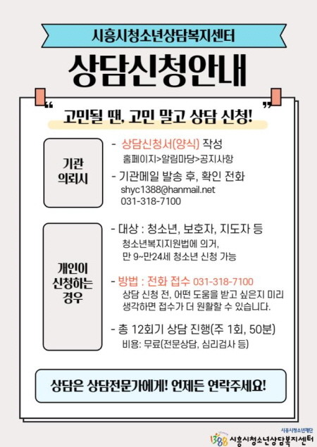 상담 신청은 시흥시청소년상담복지센터 공식 누리집에서 하거나 센터 대표전화(031-318-7100)로도 할 수 있다.