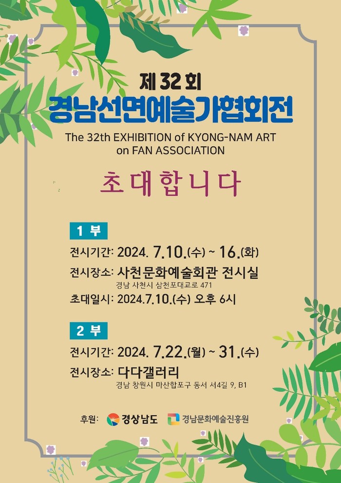 경남선면예술가협회(회장 강혜인)는 오는 7월 10일부터 16일까지 사천문화예술회관 전시실에서 ‘제32회 경남선면예술가협회전’을 개최한다.