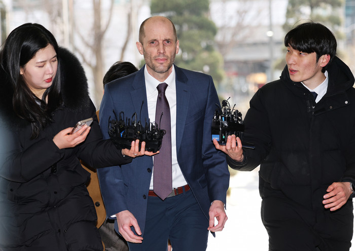 | ▲해롤드 로저스 쿠팡 한국법인 임시대표가 30일 오후 서울 종로구 서울경찰청 쿠팡 수사 종합 태스크포스(TF)에서 '셀프 조사' 관련 증거인멸 등 혐의와 관련한 피고발인 조사를 받기 위해 출석하고 있다./사진-뉴스1 |