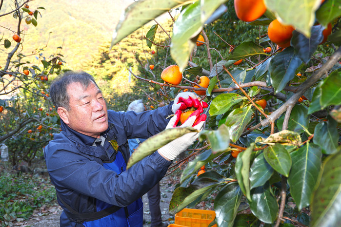 | ▲ 이승화 산청군수가 농촌 일손 돕기에서 감 수확을 하고있다.(사진=산청군) |
