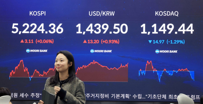 | ▲30일 서울 중구 우리은행 본점 딜링룸 전광판에 코스피 종가가 표시되고 있다. 이날 코스피는 전 거래일 대비 3.11p(0.06%) 상승한 5224.36에 코스닥은 14.97p(1.29%) 하락한 1149.44에 마감했다. /사진=뉴스1 |