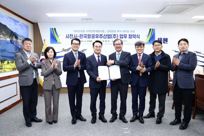 박동식 사천시장과 강구영 한국항공우주산업㈜ 대표는 27일 시청 열린시장실에서 ‘계획공모형 지역관광개발사업’의 핵심 콘텐츠인 항공산업 관광 투어를 위한 업무협약(MOU)을 체결했다.