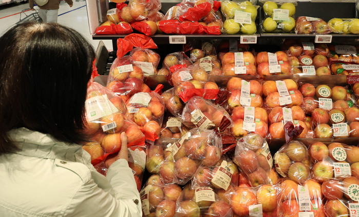 | ▲7일 서울의 한 마트를 찾은 시민이 사과를 구매하고 있다./사진=뉴스1 |