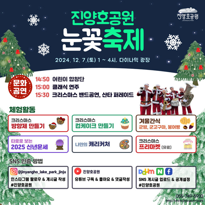 이날 오후 1시에서 4시까지 개최되는 이번 행사는 가족이 함께 진양호에서 뜻깊은 시간을 가질 수 있도록 경쾌한 문화공연과 다채로운 미리 크리스마스 체험으로 진행된다. 사전 신청 없이 누구나 자유롭게 참여 가능하다.