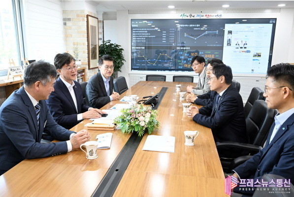 | ▲지난해 5월 안산시청에서 개최된 '경기 서부권 SOC 대개발 구상 현장 릴레이 간담회'에서 이민근 안산시장이 오후석 전 경기도 부지사 등 관계자에게 시 현안사항을 전달하고 있다.(사진=안산시) |