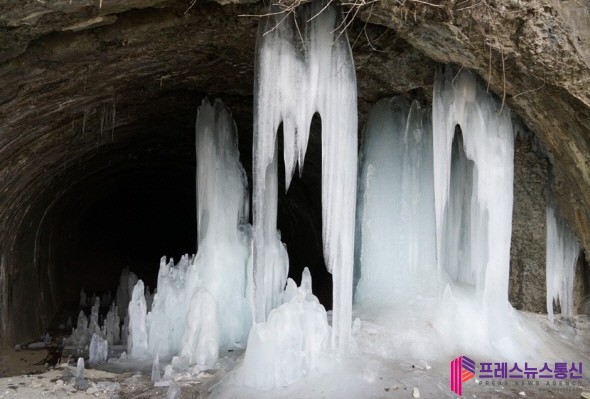 위아래로 자란 고드름이 맞물린 터널 안은 마치 입을 벌린 상어의 이빨처럼 보인다. 12월 중순부터 이듬해 2월까지 만날 수 있는 이 풍경은, 거꾸로 올라가는 연어 떼처럼 대한민국의 역동성을 상징하는 장면이기도 하다.