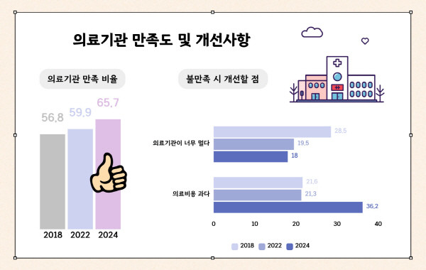 환경 및 의료 서비스에 대한 만족도는 전반적으로 개선된 것으로 나타났다. 녹지환경(자연경관 및 공원, 녹지 등) 만족도는 57.8%로 2022년 대비 상승했으며, 대기질(47.6%)과 수질(45.5%) 만족도도 각각 2.1%포인트, 5.6%포인트 증가했다. 의료서비스에 대해서는 전체 응답자의 65.7%가 만족한다고 밝혔고, ‘의료비 과다’(36.2%)가 가장 큰 불만 요인이었다. 반면 ‘의료기관 접근성’에 대한 불만은 2018년 28.5%에서 2024년 18.0%로 감소해, 최근 의료기관 수 증가가 긍정적 효과를 낳고 있는 것으로 분석됐다.
