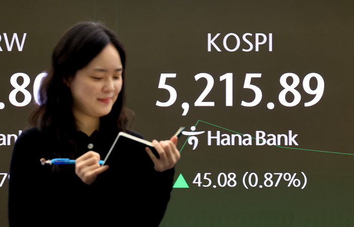 | ▲29일 서울 중구 하나은행 본점 딜링룸 전광판에 증시 현황이 표시되고 있다. 이날 코스피는 전 거래일 대비 45.08p(0.87%) 상승한 5,215.89에 코스닥은 24.34p(2.15%) 상승한 1,157.86에 개장했다./사진-뉴스1 |