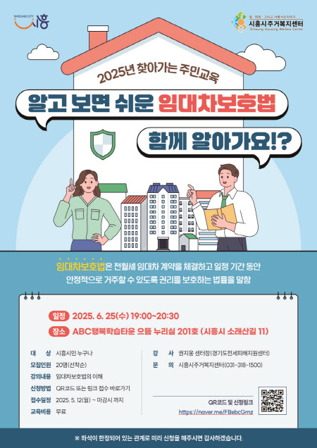 시흥시주거복지센터 관계자는 “이번 교육이 임대차 분쟁을 예방하고, 시민들이 자신의 권리와 의무를 명확히 이해하는 데 실질적인 도움이 되길 바란다”라며 관심 있는 시민들의 적극적인 참여를 당부했다.