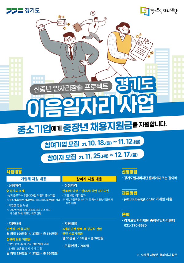사업에 대한 보다 자세한 사항은 경기도일자리재단 고용성장본부 중장년일자리센터에서 문의가 가능하다.