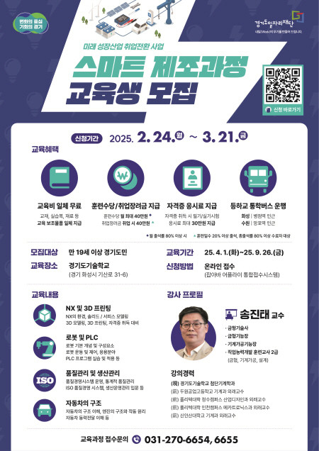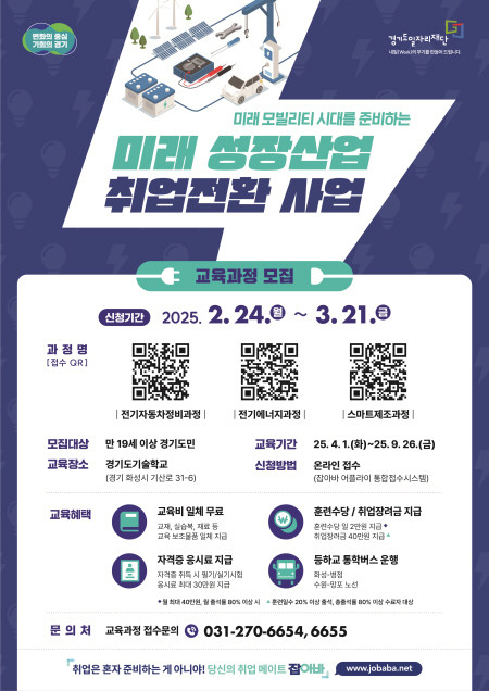 이진희 경기도일자리재단 융합인재본부장은 “전기차, 전기에너지, 스마트제조 등 미래 산업에서 요구하는 기술을 익히고, 취업까지 연계될 수 있도록 적극 지원할 계획”이라며, “많은 청년과 구직자들이 이번 교육을 통해 성장할 기회를 잡길 바란다”고 말했다.