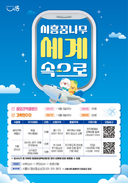 자세한 내용 및 신청 방법은 시흥시청 누리집의 ‘고시공고’ 게시판이나 네이버카페 ‘시흥꿈나무 세계 속으로!(https://cafe.naver.com/shglobalclub)’ 모집 공고문을 참고하면 된다.