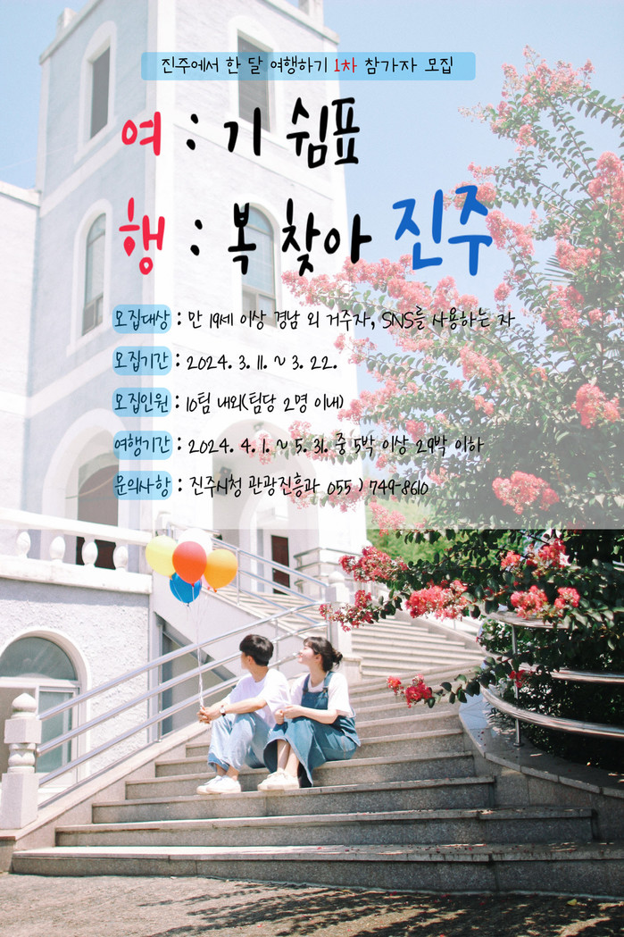 2024년 경남에서 한 달 여행하기 사업의 일환인 ‘여:기 쉼표 행:복 찾아 진주’는 참가자가 진주시에 장기간 머물면서 직접 여행을 기획하고 개인 SNS 홍보 활동 과제를 수행, 많은 사람들에게 진주 여행의 유익한 정보를 제공하고 진주시의 숨은 관광명소를 홍보하는 사업이다.