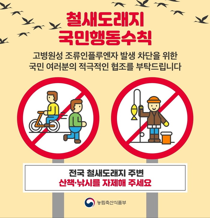 시 관계자는 “특히 전국 철새도래지 주변 산책·낚시를 자제해 달라”며 “사육 가금에서 폐사 증가, 산란율 저하 등 고병원성 AI 의심 증상이 관찰되면 즉시 방역당국에 신고해 줄 것”을 당부했다.