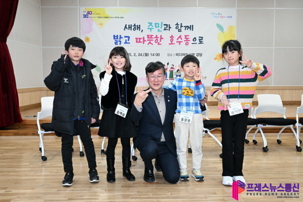 | ▲이민근 안산시장(가운데)이 지난 24일 안산미디어도서관에서 열린 '희망을 나누는 첫인사, 동행' 호수동에 참석한 아동들과 기념촬영을 하고 있다.(사진=안산시) |