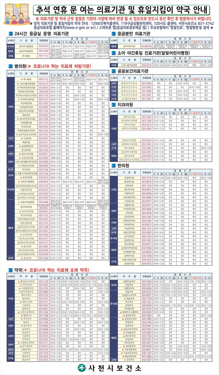 ▲추석 연휴 문 여는 의료기관 및 휴일지킴이 약국 안내 포스터(사진=사천시) |