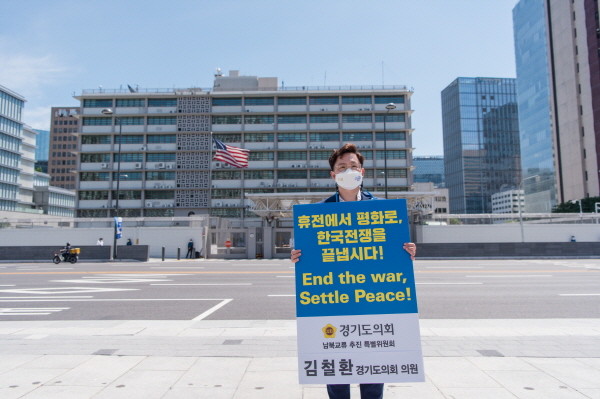 김철환 의원은 경기도의회 남북교류추진특별위원회(남북교류특위) 위원으로서 이번 1인 시위에 참가하여 정전협정 체결 68주년을 맞아 종전선언을 강력하게 촉구했다.