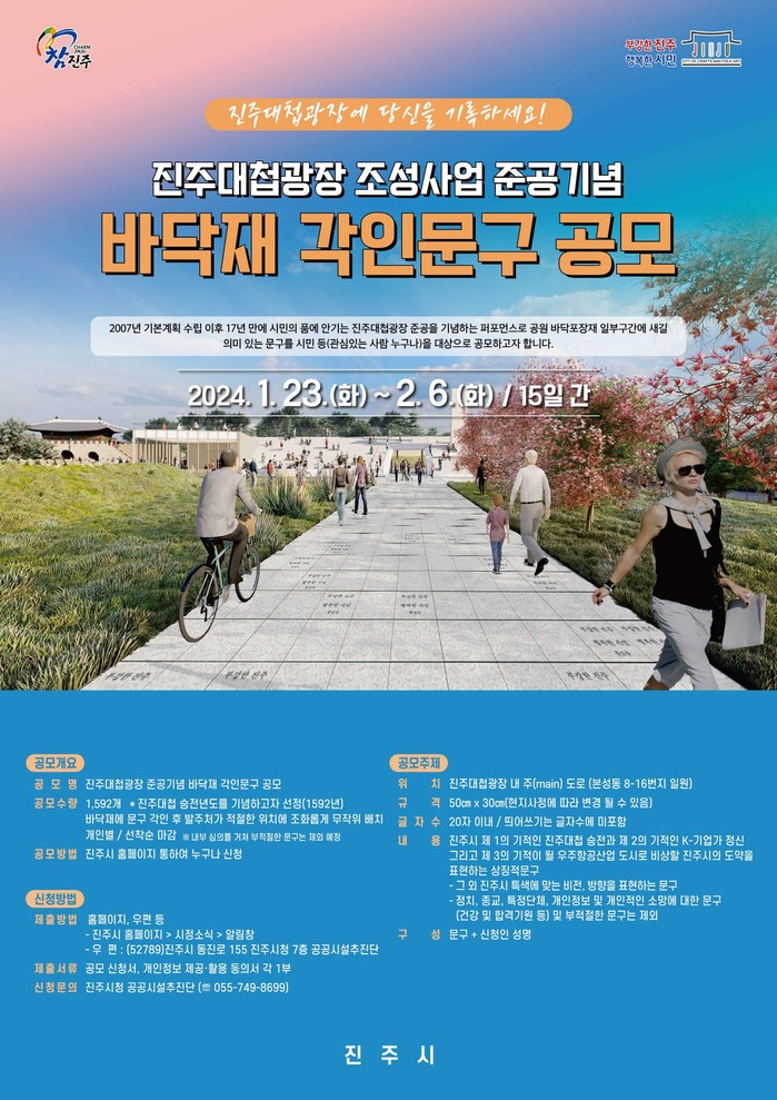 시는 장기간에 걸쳐 어렵게 추진된 사업인 만큼 진주대첩광장 조성사업 준공의 역사적인 순간을 후세에 길이 남기기 위해 준공기념 바닥재 각인 문구를 공모한다.
