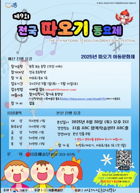 [프레스뉴스] 장현준 기자= 시흥시(시장 임병택)는 전국 초등학생을 대상으로 아동의 창의성과 재능을 발휘할 기회를 제공하고자 5월 1일부터 10일까지 ‘2025년 제9회 전국 따오기아동동요제’에 참여할 독창자와 중창팀을 모집한다.