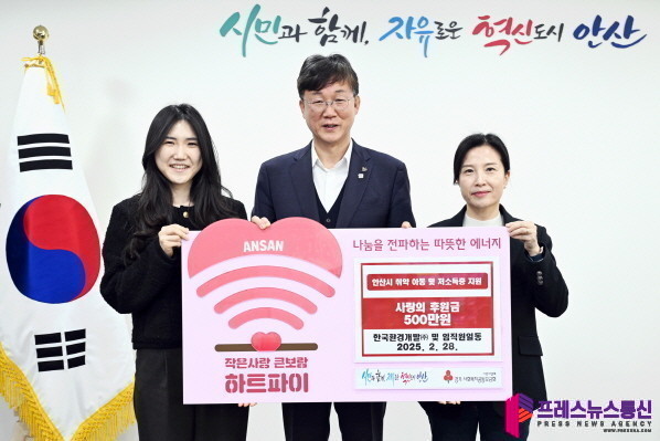 [프레스뉴스] 장현준 기자= 안산시(시장 이민근)는 지난달 28일 한국환경개발(주)(대표이사 조현희) 및 임직원으로부터 사랑의 후원금 500만 원을 기탁받았다고 4일 밝혔다.