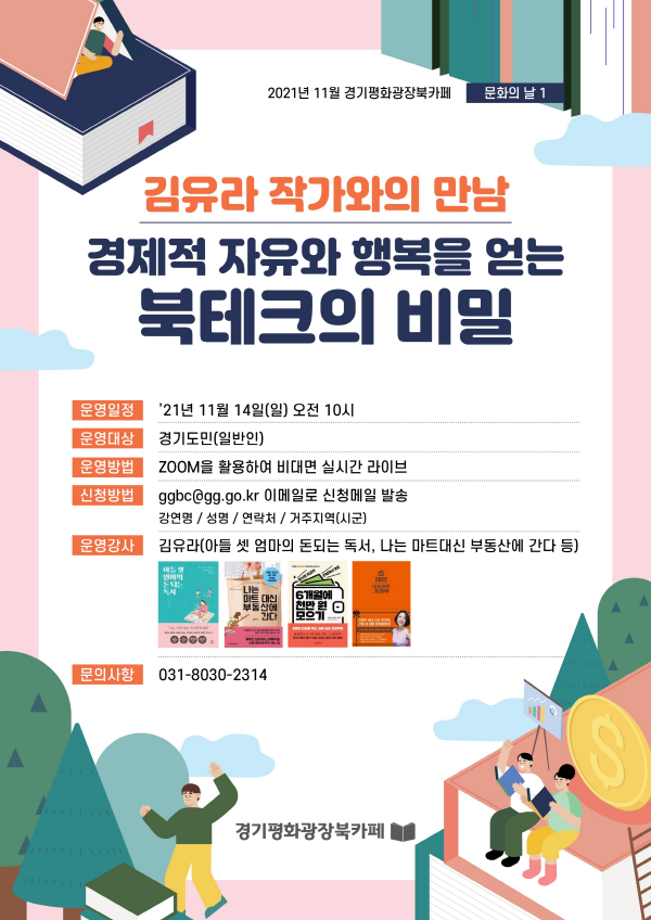 먼저 오는 14일 일요일 오전 10시에는 <아들 셋 엄마의 돈 되는 독서>, <나는 마트 대신 부동산에 간다> 등의 저자를 초청해 ‘김유라 작가와의 만남’을 진행한다.