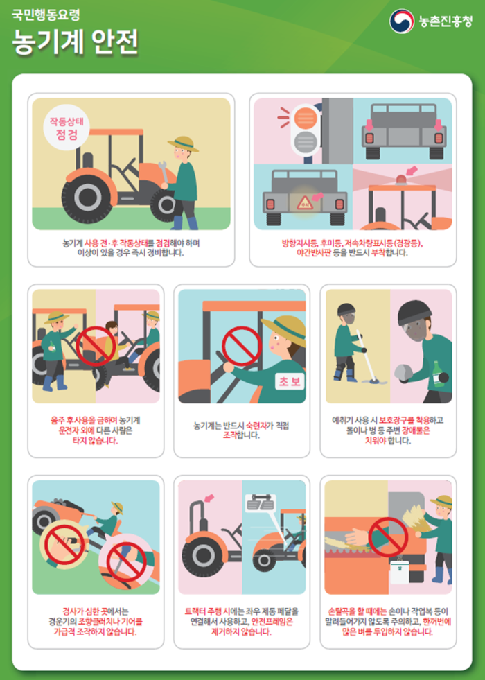 ▲야간시간대 운행 시에는 뒷면에 야광 반사판 같은 등화 장치를 반드시 부착해야 하며, 흙 등 이물질로 가려지지 않도록 관리하도록 한다. ▲농기계 작업 중 몸이 나른하고 피곤해지면 집중력이 떨어지고 작은 부주의도 사고로 이어지기 쉬운 만큼 작업 중에는 틈틈이 휴식을 취해야 한다.