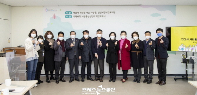 ▲ 안산시의회 의원들이 22일 지역 사회복지시설 5곳을 위문차 방문했다. 사진은 이날 의원들이 안산시장애인복지관을 방문한 모습.(사진=안산시의회) |