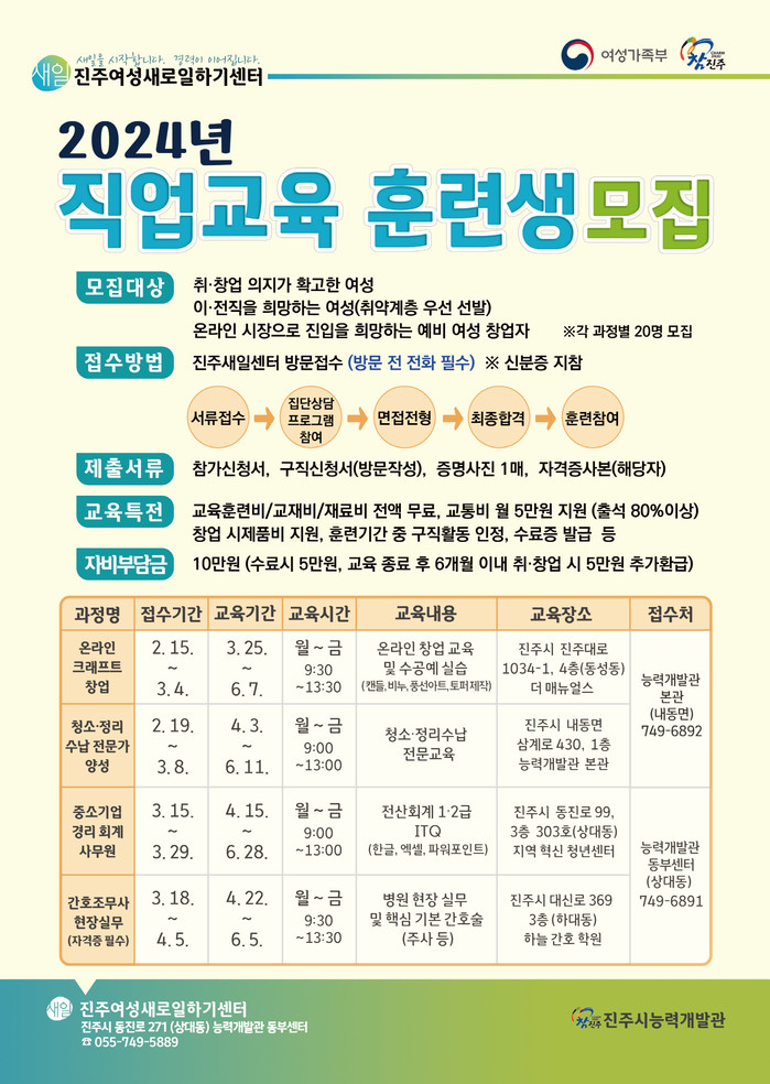 신청 자격은 취업 의지가 있는 미취업 여성이면 누구나 신청 가능하며, 접수 기간은 과정별로 상이하다. 자세한 내용은 진주새일센터에 문의하면 된다.