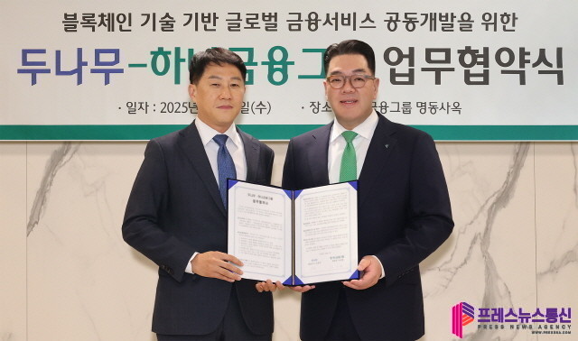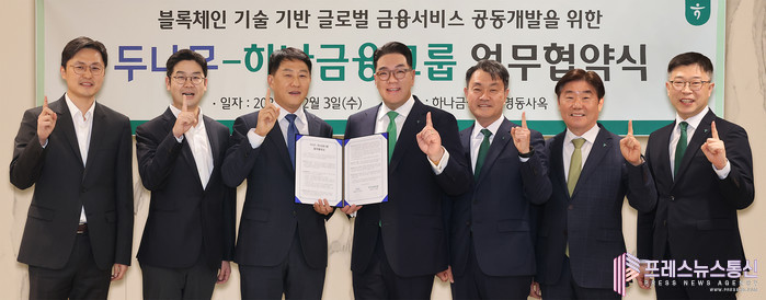 [프레스뉴스] 류현주 기자= 하나금융그룹(회장 함영주)은 지난 3일 오후 하나금융그룹 명동사옥에서 두나무(대표이사 오경석)와 블록체인 기술을 활용한 금융서비스 공동 개발을 위한 업무협약을 체결했다고 밝혔다.