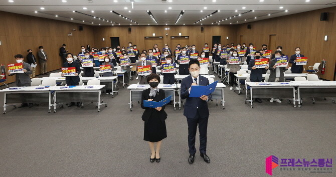 고은정(고양10) 기획수석의 사회로 진행된 결의대회는 남종섭 대표의원의 인사말, 오석규(의정부4), 김미정(오산1)의원의 성명서 낭독 순으로 진행됐다.