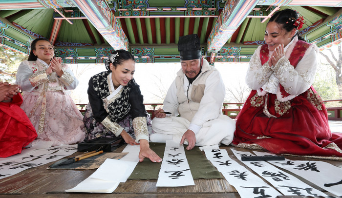 | ▲ 절기상 입춘(立春)을 이틀 앞둔 2일 경기 용인시 기흥구 한국민속촌에서 외국인 관광객들이 입춘첩을 보며 신기해 하고 있다./사진-뉴스1 |