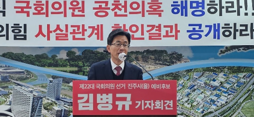 이에앞서 국민의힘 진주을 김병규 예비후보는 이날 오전 진주시청 브리핑룸에서 기자회견을 갖고, 국민의힘 중앙당에 제출한 ‘이의제기’에 대한 사실확인 결과를 신속하게 공개해 줄 것과 강민국후보를 둘러싼 각종 의혹에 대해 강후보의 직접 해명을 촉구했다.
