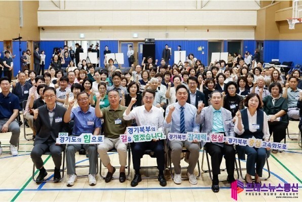| ▲2025년 9월 15일 오후 민락국민체육센터에서 열린 경기북부 중심 고속화도로 현장 간담회에서 김동연 경기도지사와 지역주민 등이 기념촬영을 하고 있다.(사진=경기도) |