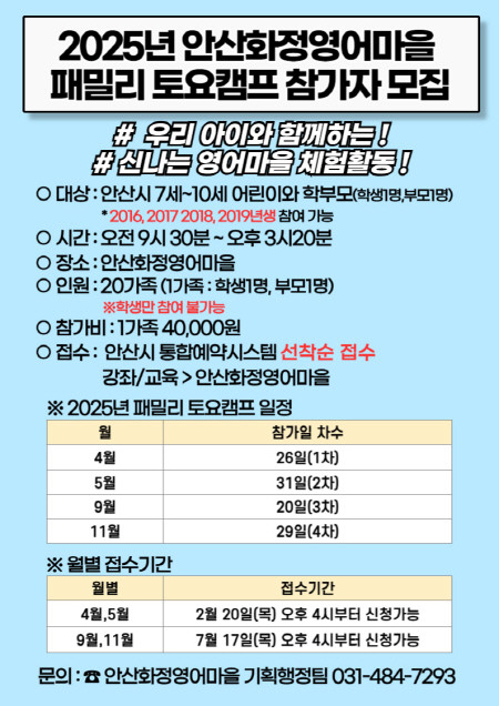| ▲2025년 안산화정영어마을 패밀리 토요캠프 참가자 모집 포스터(사진=안산시) |