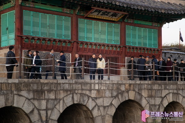 | ▲지난 18일 오후 수원특례시 화성 용연 일대에서 김동연 도지사, 헹 스위 킷 싱가포르 부총리가 친교산책 중 기념촬영을 하고 있다.(사진=경기도) |