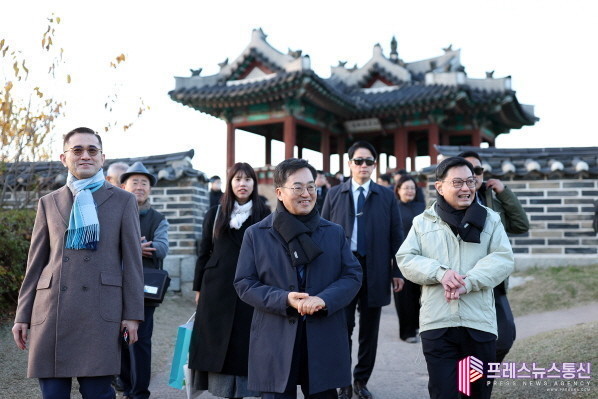 | ▲지난 18일 오후 수원특례시 화성 용연 일대에서 김동연 도지사, 헹 스위 킷 싱가포르 부총리가 산책을 하고 있다.(사진=경기도) |