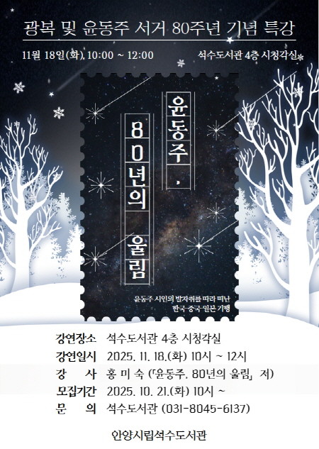 석수도서관 관계자는 “이번 광복 80주년 기념 특강 ‘윤동주, 80년의 울림’을 통해 시민들이 광복의 역사적 의미를 되새기고, 윤동주 시인의 작품 속 문학적인 맥락을 더욱 깊이 이해하는 시간이 되었으면 좋겠다”고 밝혔다.
