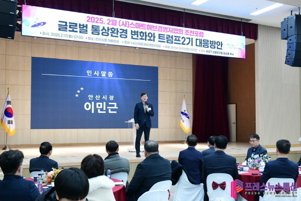 [프레스뉴스] 장현준 기자= 안산시(시장 이민근)는 지난 17일 (사)스마트허브경영자협회와 함께 안산시청 대회의실에서 ‘글로벌 통상환경 변화와 트럼프 2기 대응 방안’을 주제로 조찬 포럼을 개최했다고 18일 밝혔다.