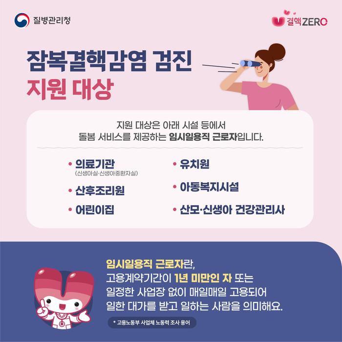 이번 검진은 최근 돌봄시설 등에서 단기근로자 결핵 감염이 지속적으로 발생함에 따라 검사 접근성이 떨어지는 이들의 잠복결핵감염 검진·치료 지원을 통해 결핵 발병을 선제적으로 예방하기 위한 것이다.