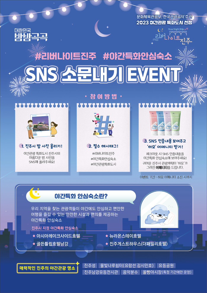 이벤트 참여 방법은 선정된 안심숙소 4곳 중 한 곳에서 숙박하고 진주시의 아름다운 밤 사진을 필수 해시태그 ‘#리버나이트진주’, ‘#야간특화안심숙소’, ‘#야간관광특화도시’와 함께 SNS에 올린 후 체크아웃 시 SNS에 업로드한 내용을 보여주면 된다. 이벤트 참여자에게는 귀여운 진주시 관광캐릭터 ‘하모’가 그려진 어메니티를 제공한다.