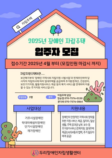 현재까지 동 사업을 통해 지역사회에 자립한 장애인은 총 5명이며, 시는 앞으로 3명을 추가 모집할 예정이다. 대상자 모집과 관련해 자세한 내용은 장애인 자립주택 수행기관으로 문의하면 된다.