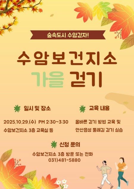 [프레스뉴스] 장현준 기자= 안산시(시장 이민근) 상록수보건소 수암보건지소는 지역 주민의 건강증진을 도모하기 위해 ‘수암 가을 걷기 교실’ 참가자를 모집한다고 14일 밝혔다.