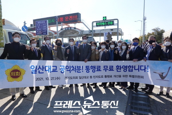 [프레스뉴스] 김대일 기자= 「경기도의회 일산대교 등 민자도로 통행료 개선을 위한 특별위원회」(이하 ‘특별위원회’)(위원장 소영환)는 27일(수) 일산대교에서 가진 일산대교 통행료 무료화 발표 및 무료통행 카운트 행사에서 낮 12시부터 실시된 일산대교 무료통행에 대한 환영 입장을 밝혔다.