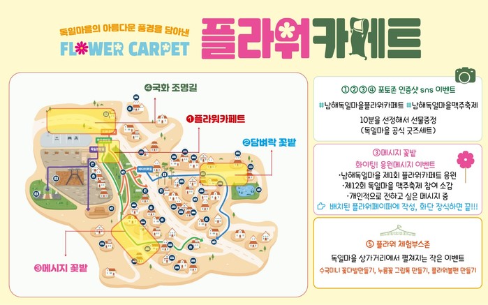 올해 첫선을 보이는 ‘남해독일마을 플라워 카페트 이벤트’는 문화체육관광부 공모사업인 계획공모형 지역관광개발사업의 하나로, 경상남도·남해군·남해관광문화재단이 함께 추진한다.